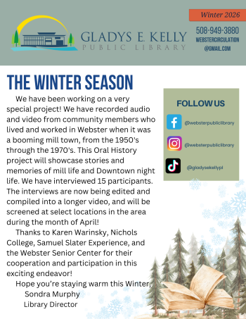 Our Winter Newsletter is hot off the presses! Check out the fun events we have planned for fall, including Winter Reading raffle, the Amrchair Travel Series, and Saturday family programs funded by the United Way of South Central Massachusetts.
