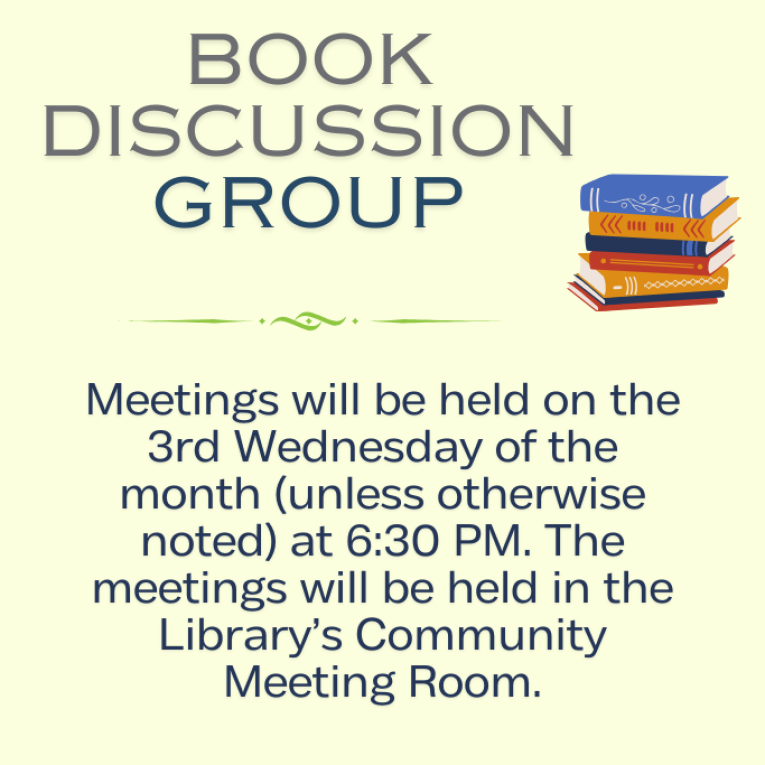 The Gladys E. Kelly Public Library Book Discussion Group for adults meets at 6:30 pm on the third Wednesday of the month unless otherwise noted. New members are always welcome!